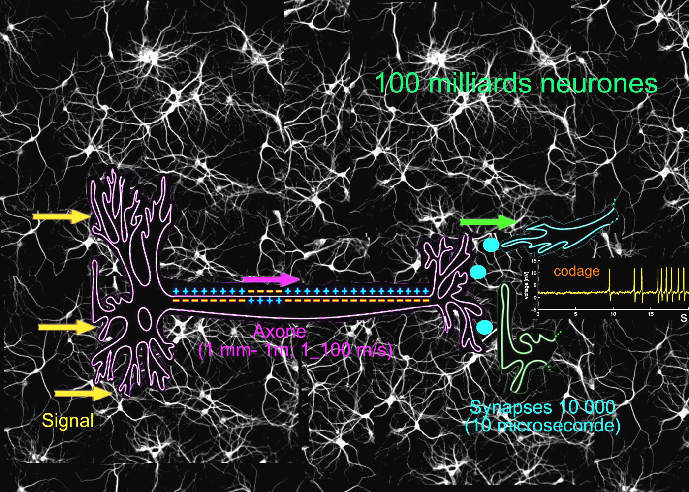Une information est captée par un ou plusieurs des cinq sens (vue, toucher, ouïe, odorat, goût) et est conduit après transformation en un signal ionique jusqu’aux entrées d’une série de neurones. Si la somme des entrées est supérieure à une certaine valeur seuil, un potentiel d’action est engendré qui se propage le long de la fibre nerveuse, ou axone, dont la longueur peut atteindre un mètre. La vitesse de propagation est au maximum de 100m/s. Tous les potentiels d'action ont la même amplitude (+100mV), mais l'influx nerveux est codé en fonction du signal d’entrée en modulant le nombre de signaux par seconde (codage en fréquence). À l’extrémité du neurone, l’influx conduit à la libération d’ions et de molécules contenus dans des vésicules (de 1 000 à 2 000 espèces environ) dans l'espace synaptique qui le sépare du neurone suivant. Les neurotransmetteurs libérés atteignent la membrane de celui-ci par simple diffusion. La concentration en acétylcholine, à titre d’exemple, dans la fente synaptique atteint une concentration de 100 mmol/l en à peu près 10 µs et subsistera 100 µs.