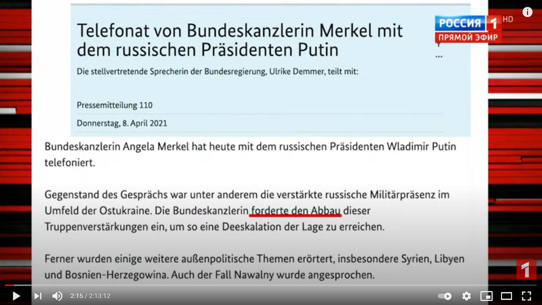 La partie allemande vient de publier une version de la conversation entre Merkel et Poutine en utilisant une expression — si possible, je la montrerai en allemand, parce que je me suis vraiment intéressé, j'ai appelé et demandé ce que cela signifiait au juste. Je ne connais pas l'allemand, cette langue me donne des sensations, disons, difficiles [Ici Soloviev fait allusion à ses origines juives. — NdT], mais là-bas il y a une phrase, disons, étrange : « Elle a exigé. » Oui-oui, elle a exigé. Qu'est-ce que ça veut dire ? [À haute voix, avec mépris :] Forderte den Abbau.